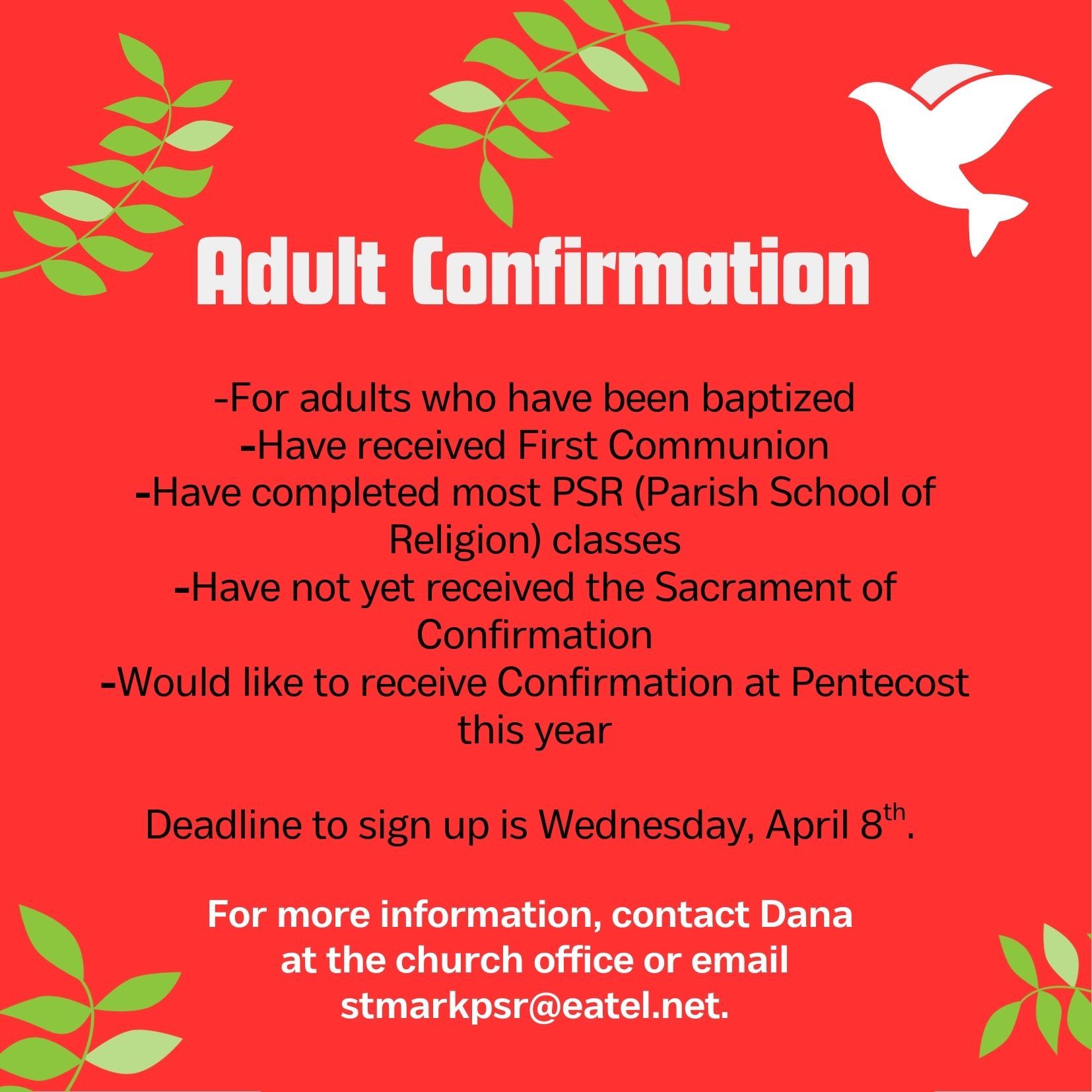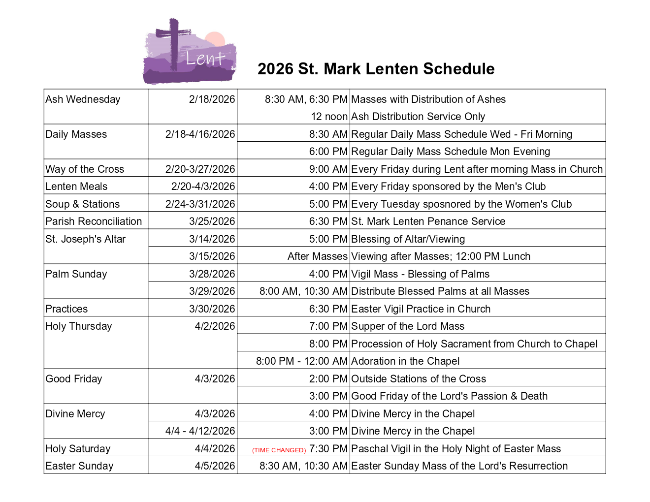 The St. Mark Lenten Penance Service will be Thursday, March 25, 2026 at 6:30pm in the Church. Monthly Adoration with Father Joseph will follow.